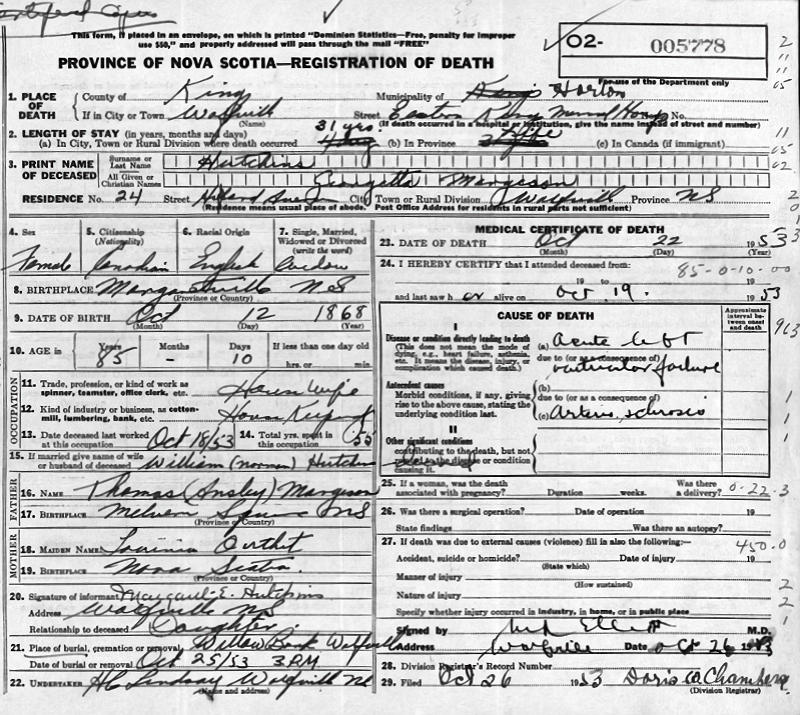 Parents Father: MARGESON, Thomas Ansley Mother: OUTHIT, Lavinia Jane Birth Born on October 12, 1868 in Margaretsville, Annapolis Co., NS Death Died on October 22, 1953 in Wolfville, Kings Co., NS Buried in Willow Bank Cemetery in Wolfville, Kings Co., NS Marriages HUTCHINS, William Norman Married on November 05, 1902 in Margaretsville, Annapolis Co., NS Children HUTCHINS, Ralph Margeson: March 14, 1904 - March 16, 1904 HUTCHINS, Margaret Emma: April 30, 1906 - March 09, 1995 Notes Death: Acute Left Ventricular Failure Sources Nova Scotia Deaths: Year 1953 #5778 Images Georgetta Margeson Birth William & Georgetta (Margeson) Hutchins Georgetta (Margeson) Hutchins Death Georgetta Margeson Marriage
