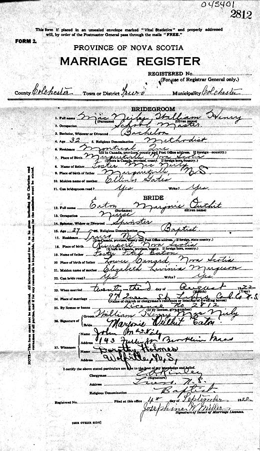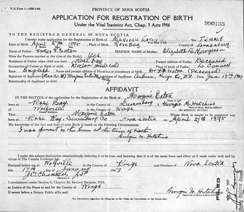 Parents Father: EATON, Foster Fitch Mother: MARGESON, Elizabeth Lavinia Birth Born on April 27, 1895 in Rose Bay, Lunenburg Co., NS Death Died on July 10, 1969 in New Westminister, Metro Vancouver Region, BC Buried in Ocean View Burial Park in Burnaby, Metro Vancouver Region, BC Marriages MACNEILY, William Henry Married on August 23, 1922 in Truro, Colchester Co., NS Children MACNEILY, Malcolm Gates: May 01, 1924 - November 30, 1982 MACNEILY, Jack Eaton: January 22, 1927 - April 11, 1960 MACNEILY, Murray Margeson: September 11, 1931 - 1991 MACNEILY, Kathleen Outhit: 1934 Notes Occupation: Registered Nurse Death: Arteriosclerotic Heart Disease Sources BC Deaths: 69-09-011841 Images Marjorie Eaton Birth Marjorie (Eaton) MacNeily Marjorie Eaton Marriage