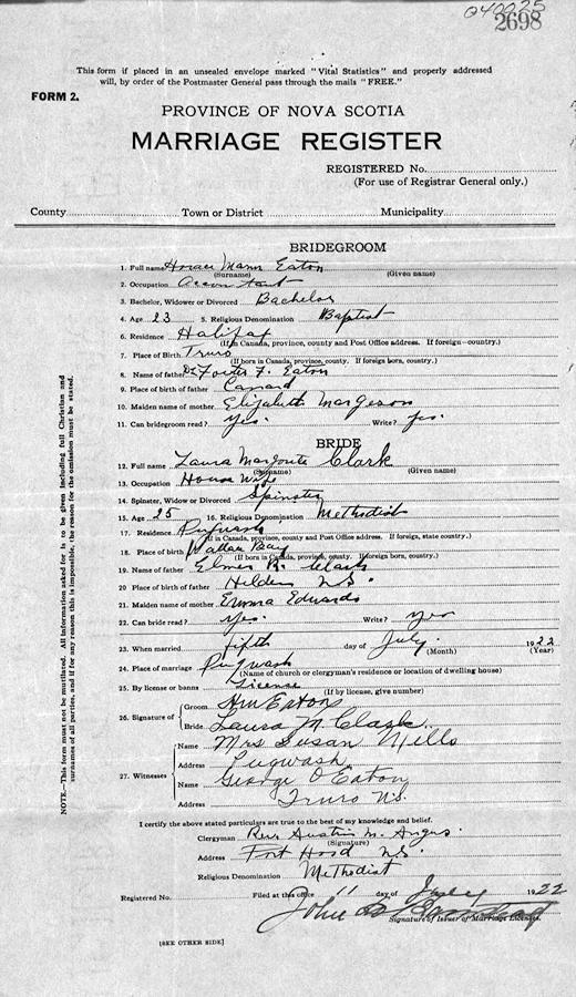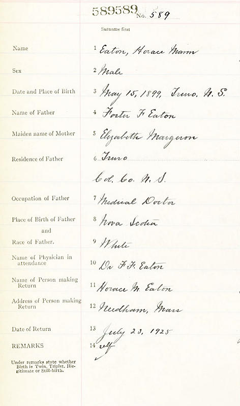 Parents Father: EATON, Foster Fitch Mother: MARGESON, Elizabeth Lavinia Birth Born on May 15, 1899 in Truro, Colchester Co., NS Death Died on 1985 in Franklin, Norfolk Co., MA Marriages CLARK, Laura Marguerite Married on July 05, 1922 in Pugwash, Cumberland Co., NS Children EATON, June Clark: June 06, 1924 - August 26, 2011 EATON, Virginia Margeson: October 19, 1925 - December 05, 2021 EATON, Horace Foster: August 25, 1927 - January 13, 2013 EATON, Shirley Anne: November 06, 1934 Notes Occupation: Accouintant/ Assistant Credit Manager/ Salesman/ Clerk Felt Manufacturer Images Horace Eaton Birth Horace Eaton Marriage