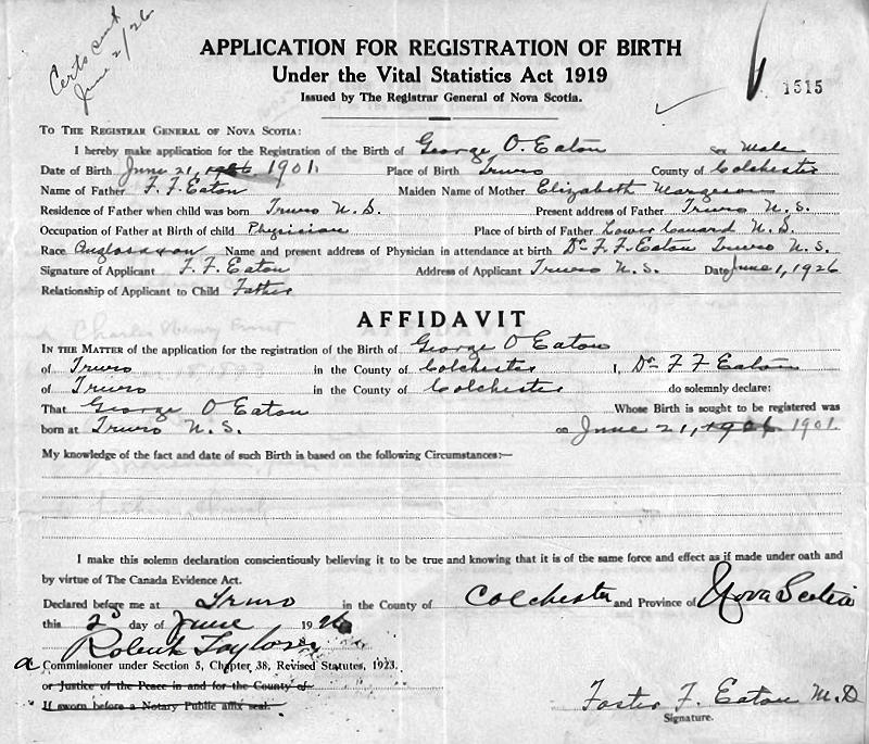 Parents Father: EATON, Foster Fitch Mother: MARGESON, Elizabeth Lavinia Birth Born on June 21, 1901 in Truro, Colchester Co., NS Death Died on December 11, 1975 in Baltimore, MD Buried in All Hallows Cemetery in Snow Hill, Worcester Co., MD Marriages JOHNSON, Catherine Children EATON, David R. EATON, William F. Notes Occupation: Physician - Surgeon Sources Findagrave.com: https://www.findagrave.com/memorial/166220024/george_outhit-eaton Images George O. Eaton Birth George O. Eaton