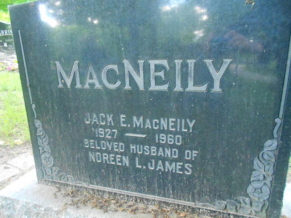 Parents Father: MACNEILY, William Henry Mother: EATON, Marjorie Outhit Birth Born on January 22, 1927 in Montreal, QC Death Died on April 11, 1960 in Barrie, Simcoe Co., ON Buried in Barrie Union Cemetery in Barrie, Simcoe Co., ON Marriages JAMES, Noreen L. Notes Occupation: Teacher/ Dentist Sources My Heritage: https://www.myheritage.com/research/record-1-OYYV6YN7AWJP4ZT5T5WTK4RBTLG7PWA-2-5469/dr-jack-e-macneily-in-myheritage-family-trees Images Jack MacNeily