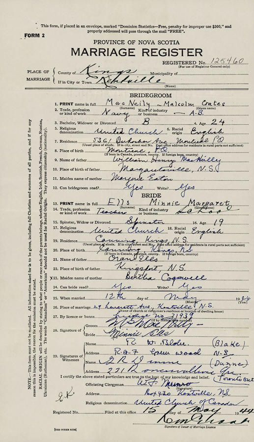 Birth Born on 1925 in Canning, Kings Co., NS Marriages MACNEILY, Malcolm Gates Married on May 12, 1944 in Kentville, Kings Co., NS Notes Occupation: Teacher Images Malcolm MacNeily Marriage