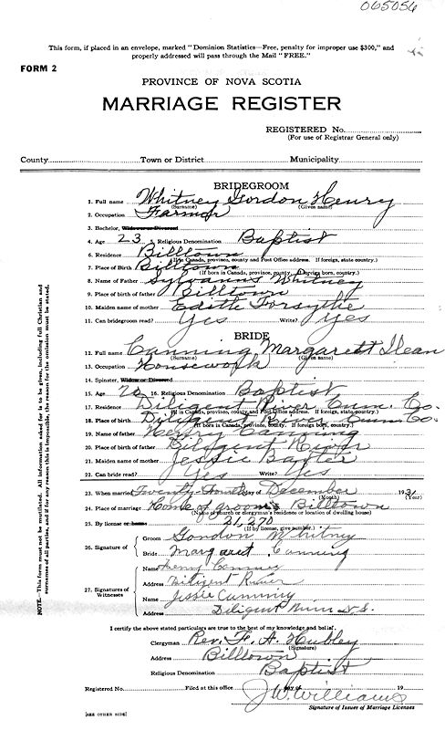 Parents Father: CANNING, David Henry Mother: BAXTER, Jessica Maude Birth Born on January 13, 1911 in Diligent River, Cumberland Co., NS Death Died on January 05, 1967 in Wolfville, Kings Co., NS Buried in Willowbank Cemetery in Wolfville, Kings Co., NS Marriages MANNING, Ralph Hamilton Married on January 17, 1942 in Waterville, Kings Co., NS WHITNEY, Gordon Henry Married on December 24, 1931 in Billtown, Kings Co., NS Children MANNING, Sharyn Patricia: September 30, 1944 MANNING, Bonita Frances: October 30, 1948 - June 23, 2016 Notes Occupation: Hairdresser Death: Bulbar Palsy Sources Nova Scotia Deaths: Year 1967 #1108 Images Ralph & Margaret (Canning) Manning & Bonita (Manning) Loomer. Marguerite (Whitney) Manning Death Gordon Whitney Marriage Ralph H. Manning Marriage2 Ralph Manning Marriage2
