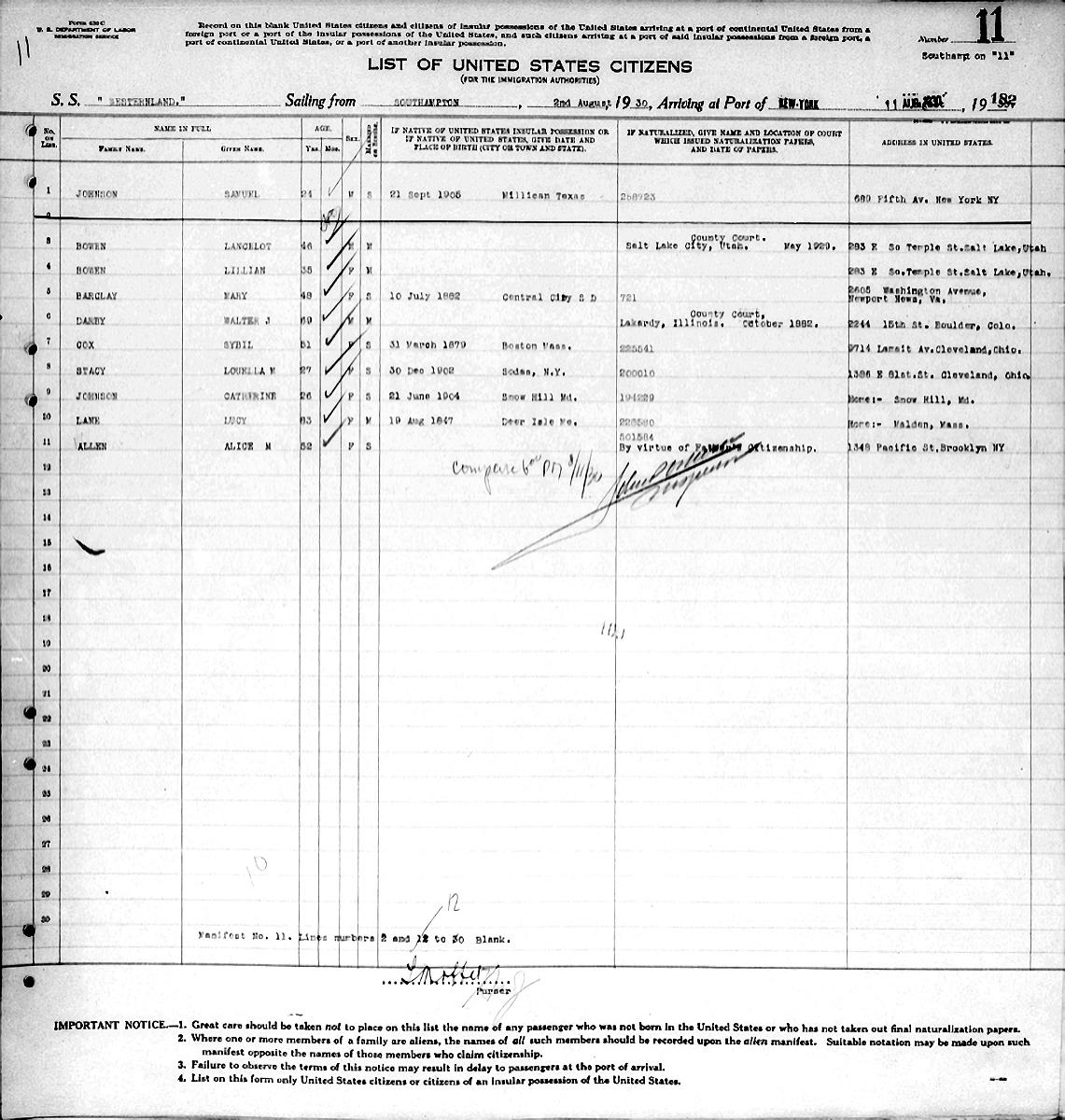 Birth Born on June 21, 1904 in Snow Hill, Worcester Co., MD Death Died on October 27, 2011 in Millsboro, Sussex Co., DE Buried in All Hallows Cemetery in Snow Hill, Worcester Co., MD Marriages EATON, George Outhit Children EATON, David R. EATON, William F. Sources Newspaper Obituary: The Sun Baltimore,MD November 11,2011 Images Catherine (Johnson) Eaton Catherine Johnson Passenger List