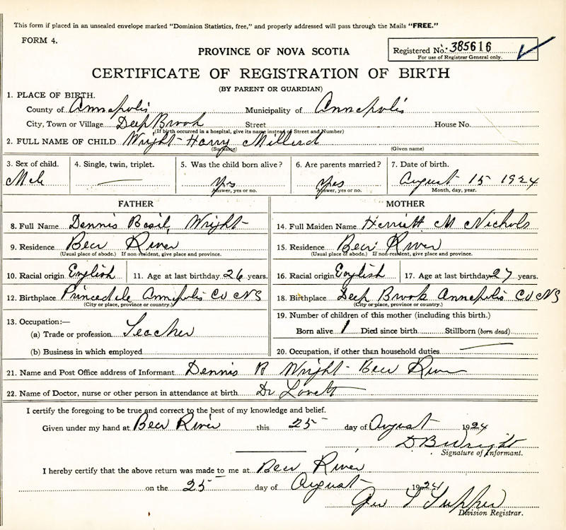 Birth Born on August 15, 1924 in Deep Brook, Annapolis Co., NS Death Died on October 26, 2022 in Halifax, Halifax Regional Municipality, NS Buried in Clementsvale Cemetery in Clementsvale, Annapolis Co., NS Marriages EATON, Virginia Margeson Married on 1947 Sources Annapolis Cemetery Records: Clementsvale Cemetery Clementsvale,NS Images Harry Wright Birth Hary & Virginia (Eaton) Wright