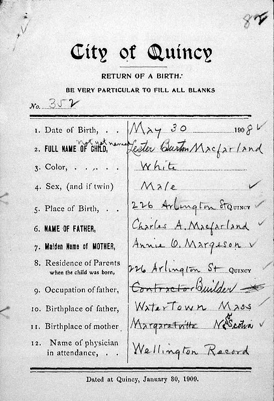 Parents Father: MACFARLAND, Charles A. Mother: MARGESON, Annie Outhit Birth Born on May 30, 1908 in Quincy, Norfolk Co., MA Death Died on December 31, 1978 in Sarasota Co., FL Buried in Blue Hill Cemetery in Braintree, Norfolk Co., MA Marriages SCHAFFNER, Helen Stuart Children MACFARLAND, Alan Lester: May 23, 1934 - April 20, 1977 Sources Florida Deaths: #97235 Images Lester MacFarland Birth Lester MacFarland