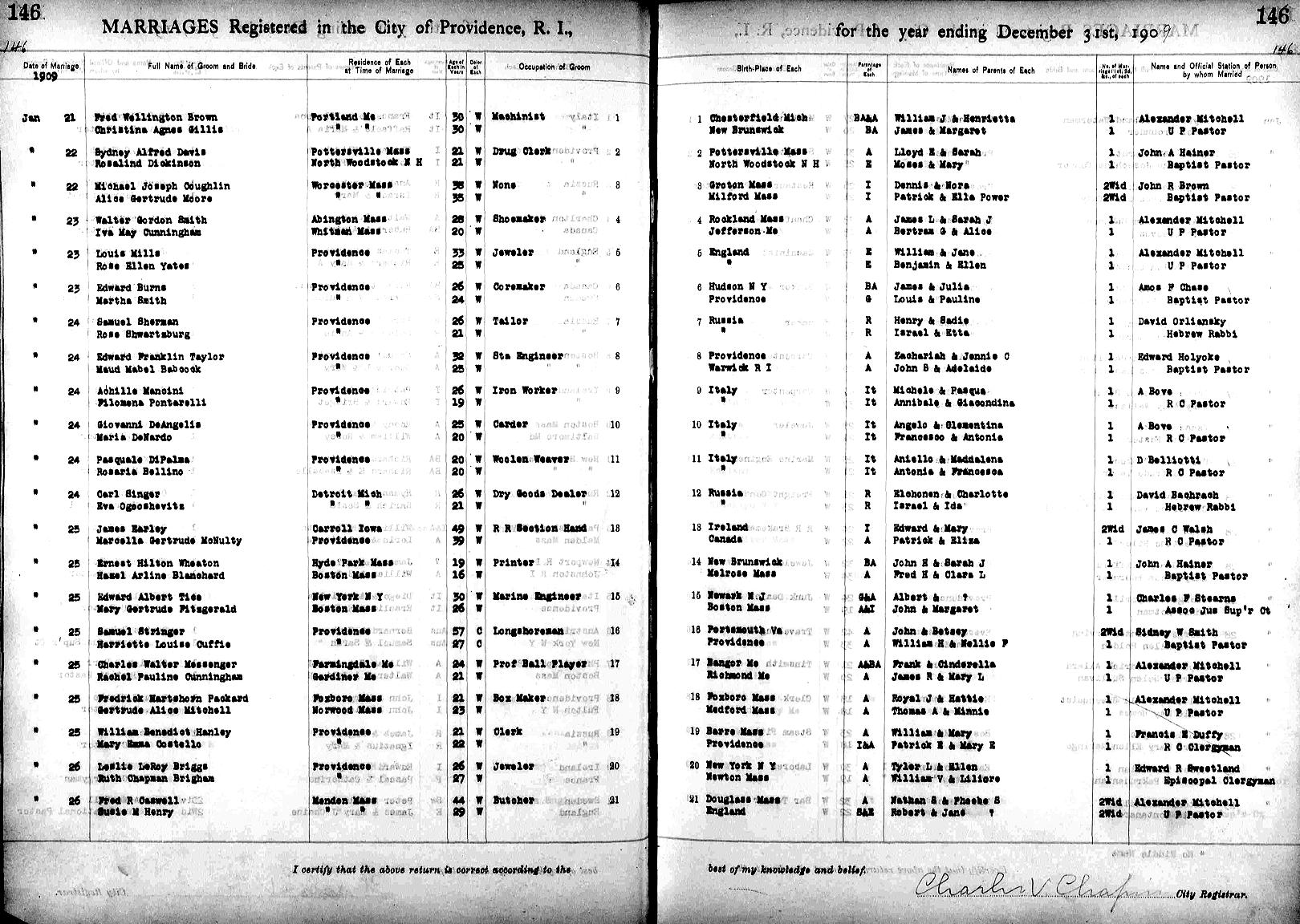 Birth Born on May 02, 1889 in Hartland, Carleton Co., NB Death Died on February 23, 1955 in Boston, Suffolk Co., MA Marriages BLANCHARD, Hazel Arline Married on January 25, 1909 in Providence, Providence Co., RI Children WHEATON, Boy: May 10, 1909 - May 12, 1909 WHEATON, Doris Ernestine: November 25, 1910 - October 24, 1984 WHEATON, Mildred Arline: June 03, 1914 - October 22, 1991 WHEATON, Eleanor Augusta: July 21, 1915 - 1956 WHEATON, Ralph Howard: March 06, 1919 - May 24, 1986 Notes Occupation: Printer/ Conductor Boston Elevated RR Sources Newspaper Obituary: Boston Herald Boston,MA February 24,1955 Images Ernest Wheaton WW1 Draft Ernest Wheaton WW2 Draft Hazel Blanchard Marriage