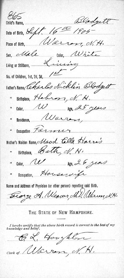 Birth Born on September 16, 1905 in Warren, Grafton Co., NH Death Died on October 07, 1991 in Brunswick, Cumberland Co., ME Buried in Bay View Cemetery in Bowdoinham, Sagadahoc Co., ME Marriages WHEATON, Doris Ernestine Married on 1931 in Boston, Suffolk Co., MA Children BLODGETT, Raymond Harris: October 27, 1933 BLODGETT, Lance Howard: July 06, 1944 - February 28, 2023 BLODGETT, Paul Nicklin: March 09, 1946 - May 17, 1997 Notes Occupation: Salesman Poultry Farm Sources Maine Deaths: #9108881 Images Raymond Blodgett Birth Raymond Blodgett