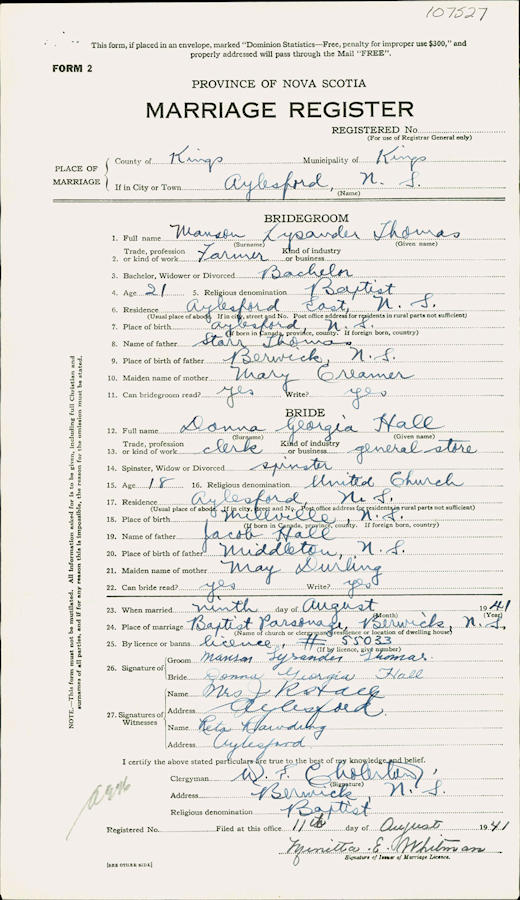 Birth Born on July 08, 1923 in Millville, Kings Co., NS Marriages THOMAS, Manson Lysander Married on August 09, 1941 in Berwick, Kings Co., NS Notes Occupation: Retail Clerk Images Donna Hall Birth Manson Thomas Marriage