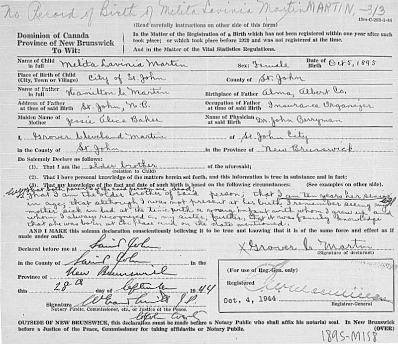 Parents Father: MARTIN, Hamilton Cleveland Mother: BAKER, Jessie Alice Birth Born on October 05, 1895 in Saint John, Saint John Co., NB Death Died on January 31, 1955 in Saint John, Saint John Co., NB Buried in Old Tremont Cemetery in Tremont Kings Co., NS Notes Death: Acute Cerebral Hemorhage/ Rupture of Cerebral Artery Sources NB Deaths: #1367 Images Melita Martin Birth Melita Martin Melita Martin Death