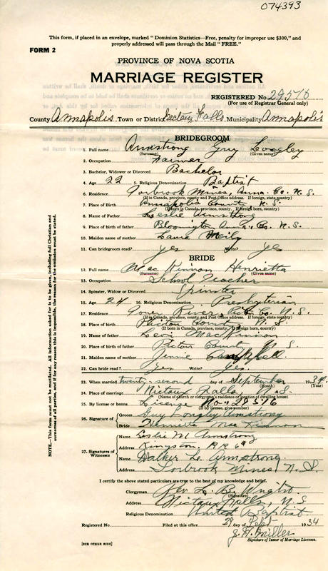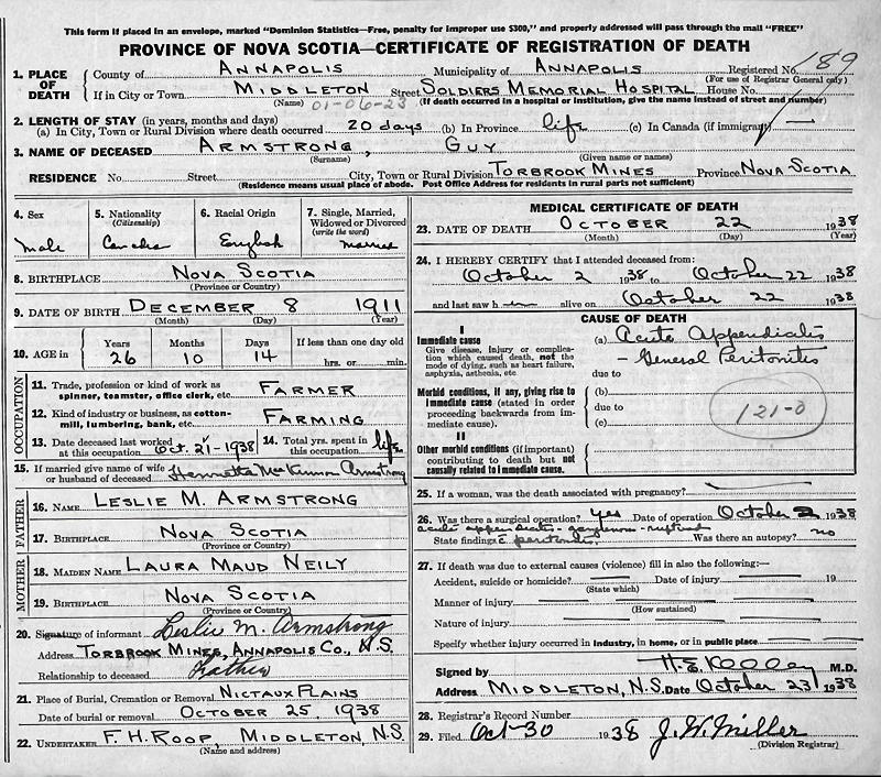 Parents Father: ARMSTRONG, Leslie Magee Mother: NEILY, Laura Maude Birth Born on December 08, 1911 in Bloomington, Annapolis Co., NS Death Died on October 22, 1938 in Middleton, Annapolis Co., NS Buried in Nictaux Cemetery in Nictaux, Annapolis Co., NS Marriages MACKINNON, Henrietta Married on September 22, 1934 in Nictaux Falls, Annapolis Co., NS Notes Occupation: Farmer Death: Acute Appendicitis/ General Peritonitis Sources Nova Scotia Deaths: Year 1938 File 176 #189 Images Guy Armstrong Birth Leslie & Laura (Neily) Armstrong,Guy & Henrietta (MacKinnon) Armstrong,Walker Armstrong Guy Armstrong Death Guy Armstrong Marriage
