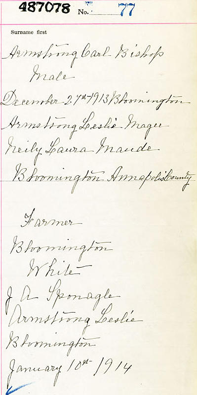 Parents Father: ARMSTRONG, Leslie Magee Mother: NEILY, Laura Maude Birth Born on December 27, 1913 in Bloomington, Annapolis Co., NS Marriages SCCHAFFNER, Margaret Chipman Married on July 28, 1937 in South Williamston, Annapolis Co., NS Notes Occupation: Lumber Mill Manager Images Carl Armstrong Birth Carl Armstrong Marriage