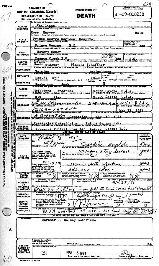 Birth Born on December 31, 1893 in Walhalla, Pembina Co., ND Death Died on May 08, 1981 in Prince George, Fraser-Fort George Region, BC Buried in River View Cemetery in Pouce Coupe, Peace River Region, BC Marriages SCHAFFNER, Blanche Winnifred Children PHILLIPPE, Bette G. PHILLIPPE, Frederick Arthur: May 02, 1922 - January 10, 1981 PHILLIPPE, Hazel Irene: January 05, 1924 - June 16, 2003 Notes Occupation: Farmer Death: Cardiac Asystole Sources BC Deaths: 81-09-008238 Images Ross & Blanche (Schaffner) Phillippe Ross Phillippe Death Ross Phillippe Obit