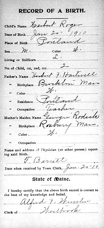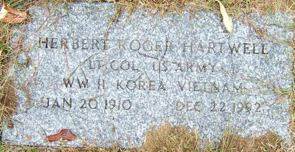 Parents Father: HARTWELL, Herbert Francis Mother: RODICK, Georgia Mabel Birth Born on January 10, 1910 in Portland, Cumberland Co., ME Death Died on December 22, 1992 in Portland, Cumberland Co., ME Buried in Riverside Cemetery in East Raymond, Cumberland Co., ME Marriages WHITCHER, Sally Married on 1936 Children HARTWELL, Roger Whitcher: June 04, 1940 HARTWELL, Allson: August 02, 1946 - August 14, 2011 Notes Occupation: Assistant Supervisor ILife Insurance Co. Military Service: WW2/ Korea/ Vietnam US Army Lt. Colonel Sources Maine Deaths: #9210364 Images Herbert R. Hartwell Birth Herbert & Sally (Whitcher) Hartwell Herbert R. Hartwell Herbert R. Hartwell