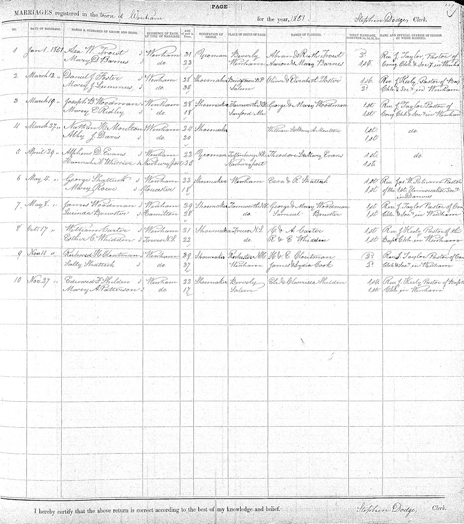 Parents Father: WHIDDEN, Robert Mother: CREELMAN, Esther Birth Born on December 20, 1826 in Middle Stewiacke, Colchester Co., NS Death Died on November 09, 1908 in Bible Hill, Colchester Co., NS Buried in Brookfield Eastside Cemetery in Brookfield, Colchester Co., NS Marriages CARTER, William Oughterson Married on October 17, 1851 in Wenham, Essex Co., MA Children CARTER, Charles Judson: October 21, 1855 - September 08, 1917 CARTER, Henrietta K.: 1857 - October 28, 1930 CARTER, May Adeline: November 09, 1858 - 1881 CARTER, William Porter: December 07, 1861 - October 26, 1937 CARTER, Edward Foster R.: June 26, 1863 - 1950 CARTER, Frances Esther: September 09, 1867 - December 15, 1933 CARTER, Arthur A.: July 09, 1869 Sources Colchester Cemeteries: Brookfield Eastside Cemetery Brookfield,NS Images William O. & Esther (Whidden) Carter William O. Carter Marriage