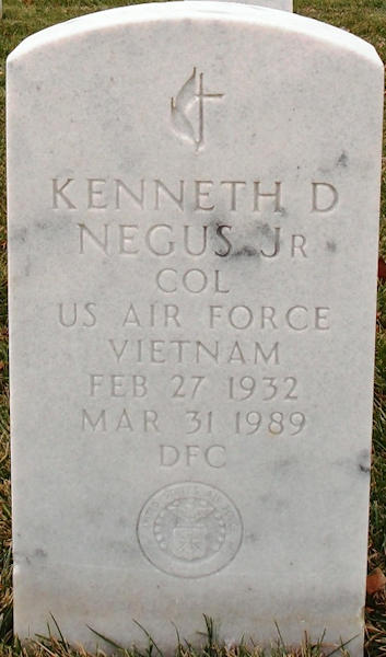 Parents Father: NEGUS, Kenneth Davis Mother: HARTWELL, Hope Birth Born on February 27, 1932 in Pittsfield, Berkshire Co., MA Death Died on March 15, 1989 in Maryland, USA Buried in Arlington National Cemetery in Arlington, Arlington Co., VA Marriages , Paige S. Notes Military Service: Vietnam USAF Colonel Sources US Social Security Index: Numerical ID Files Images Kenneth Negus Jr