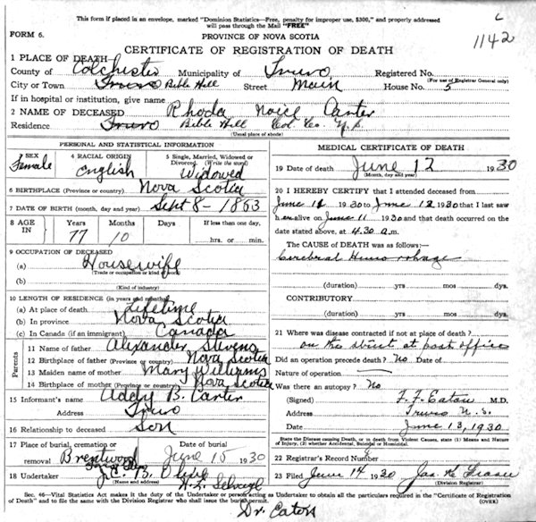 Parents Father: STEVENS, Alexander W. Mother: WILLIAMS, Mary Birth Born on September 08, 1853 in Brookfield, Colchester Co., NS Death Died on June 12, 1930 in Bible Hill, Colchester Co., NS Buried in Forest Glen Cemetery in Forest Glen, Colchester Co., NS Marriages CARTER, Charles Judson Married on February 19, 1878 in Truro, Colchester Co., NS Children CARTER, Harriet: November 05, 1879 - February 08, 1948 CARTER, Addy Burton: March 11, 1884 - June 02, 1936 Notes Death: Cerebral Hemorhage Sources Colchester Cemeteries: Forest Glen Cemetery #28 Nova Scotia Deaths: Book 119 Pg. 1142 Images Rhoda (Stevens) Carter Rhoda (Stevens) Carter Death