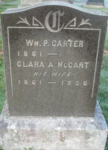Parents Father: McCART, John Douglas Mother: DAVISON, Lucretia Birth Born on September 09, 1861 in Lower Economy, Colchester Co., NS Death Died on October 02, 1930 in Truro, Colchester Co., NS Buried in Robie St. Cemetery in Truro, Colchester Co., NS Marriages CARTER, William Porter Married on December 23, 1891 in Lower Economy, Colchester Co., NS Children CARTER, Lucetta Elise: November 09, 1892 - 1980 CARTER, Ralph Harlan: June 09, 1894 CARTER, Elwyn Earl: August 15, 1895 - 1977 CARTER, Irma Etta: October 30, 1896 Notes Death: Acute Toxic Nephritis Sources Nova Scotia Deaths: Book 119 Pg. 1226 Colchester Cemeteries: Truro Robie St. Cemetery N6 #63 Images William P. & Clara (McCart) Carter