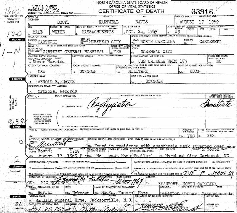Parents Father: DAVIS, Arnold Blake Mother: HARTWELL, Patience Roberta Birth Born on October 24, 1945 in Massachusetts, USA Death Died on August 17, 1969 in Morehead, Carteret Co., NC Buried in Newton Cemetery in Newton, Middlesex Co., MA Notes Occupation: US Coast Guard Death: Asphyxiation Sources North Carolina Deaths: #33916 Images Arnold & Patience (Hartwell) & Scott Davis Scott Davis Death