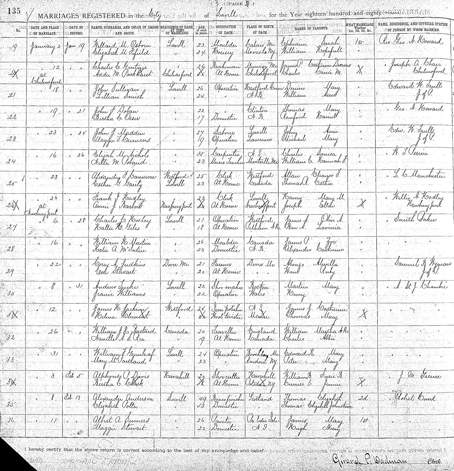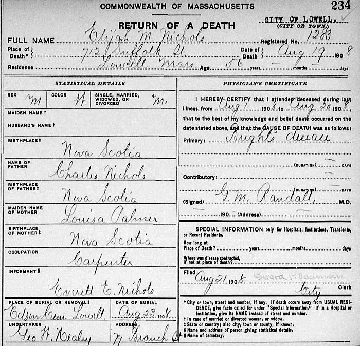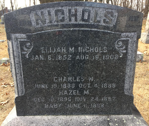 Parents Father: NICHOLS, Charles Dodge Mother: PALMER, Louisa Birth Born on January 06, 1852 in Aylesford, Kings Co., NS Death Died on August 19, 1908 in Lowell, Middlesex Co., MA Buried in Woodbine Cemetery in Lowell, Middlesex Co., MA Marriages POLAND, Nellie Mariah Married on January 16, 1889 in Lowell, Middlesex Co., MA Children NICHOLS, Charles W.: June 19, 1890 - October 04, 1890 NICHOLS, Elsie Gladys: November 11, 1891 - January 17, 1945 NICHOLS, Hazel Maud: December 18, 1896 - November 24, 1898 NICHOLS, Boy: June 12, 1898 - June 12, 1898 NICHOLS, Girl: June 12, 1898 - June 12, 1898 NICHOLS, Arthur Melbourne: January 26, 1901 - March 11, 1965 NICHOLS, William Elmer: September 26, 1905 - April 19, 1968 Notes Occupation: Carpenter Death: Bright's Disease Sources Massachusetts Deaths: Lowell Pg. 234 #1283 Images Elijah,Charles,Hazel,Girl Nichols Elijah Nichols Death Elijah Nichols Marriage