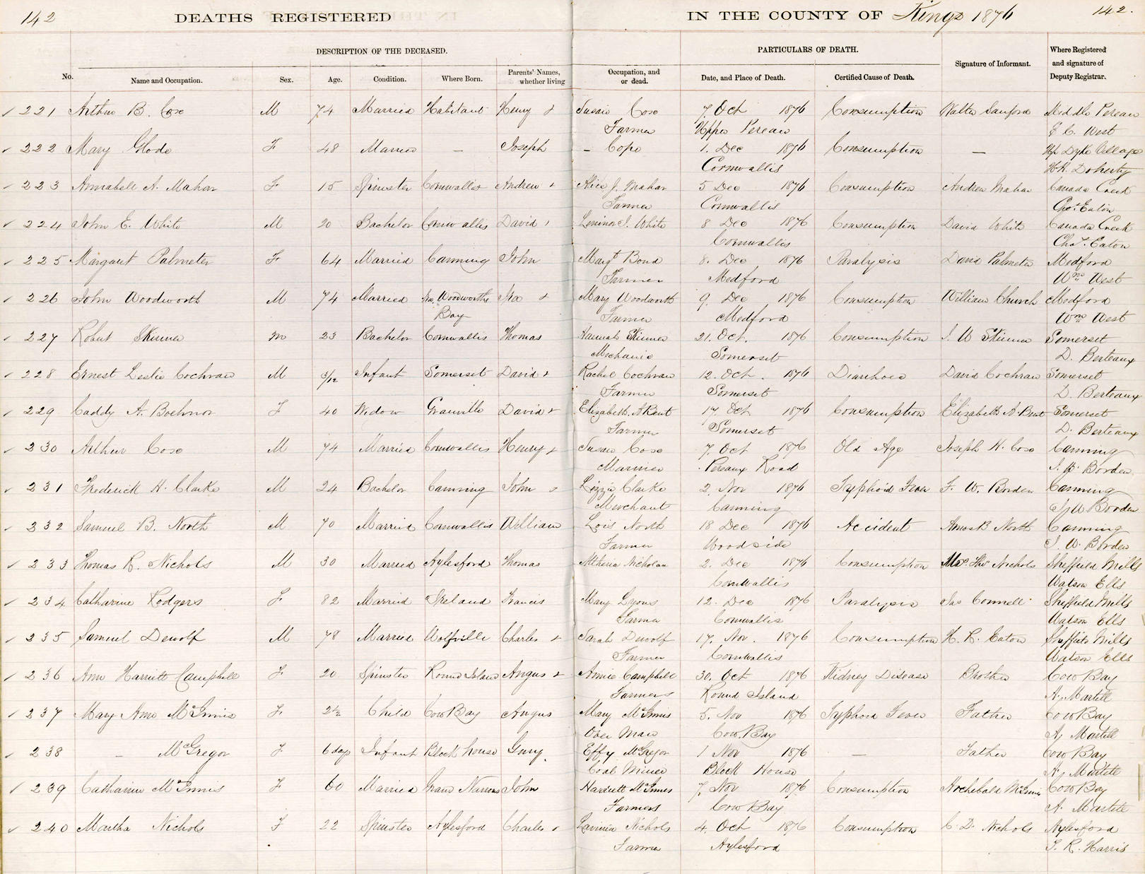 Parents Father: NICHOLS, Charles Dodge Mother: PALMER, Louisa Birth Born on 1854 in Aylesford, Kings Co., NS Death Died on October 04, 1876 in Aylesford, Kings Co., NS Buried in Aylesford Old United Cemetery in Aylesford, Kings Co., NS Notes Death: Consumption Sources Nova Scotia Deaths: Book 1811 Pg. 142 #240 Images Martha Nichols Martha Nichols Death