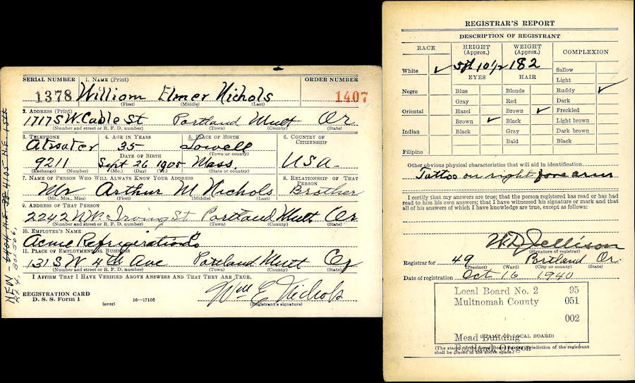 Parents Father: NICHOLS, Elijah M. Mother: POLAND, Nellie Mariah Birth Born on September 26, 1905 in Lowell, Middlesex Co., MA Death Died on April 19, 1968 in Portland, Multnomah Co., OR Buried in Oswego Pioneer Cemetery in Lake Oswego, Clackamas Co., OR Marriages HALL, Gladys Cleo Children NICHOLS, Robert Elliott: July 26, 1942 NICHOLS, Carol Ann: September 06, 1943 - October 02, 2011 NICHOLS, Richard P.: October 15, 1950 NICHOLS, Roger C.: July 04, 1955 Notes Occupation: Employee at Acme Refrigeration Co./ Ship Captain Sources Oregon Deaths: #5832 Images William E. Nichols Birth William E. & Gladys (Hall) Nichols William E. Nichols WW2 Draft William E. Nichols Ship Licensing