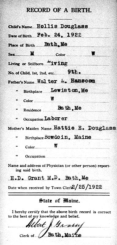 Birth Born on February 24, 1922 in Bath, Sagadahoc Co., ME Death Died on June 15, 2013 in Maine, USA Buried in Oak Grove Cemetery in Bath, Sagadahoc Co., ME Marriages PHINNEY, Gertrude Marcia Married on September 01, 1965 in Maine, USA Notes Military Service: WW2 US Army Images Hollis Hanscom Birth Hollis Hanscom