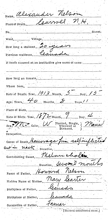 Parents Father: NELSON, John Howard Mother: CARTER, Mary Birth Born on September 04, 1872 in Brookfield, Colchester Co., NS Death Died on May 15, 1913 in Carroll, Coos Co., NH Buried in Carroll, Coos Co., NH Marriages HUNT, Georgianna (Thompson) Married on October 28, 1895 in Whitefield, Coos Co., NH Children NELSON, Raymond Willard: April 09, 1899 - October 28, 1936 Notes Death: Suicide - Self Inflicted Cut In Neck Images Alexander Nelson Alexander Nelson Death Alexander Nelson Marriage