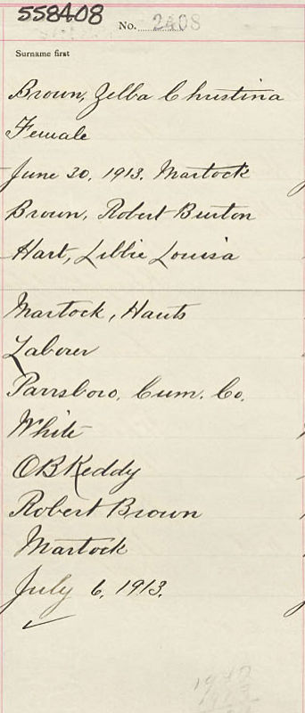 Parents Father: BROWN, Robert B. Mother: HART, Elizabeth Louise Birth Born on June 30, 1913 in Martock, Hants Co., NS Death Died on March 09, 2003 in Windsor, Hants Co., NS Buried in Falmouth Cemetery in Falmouth, Hants Co., NS Marriages COCHRANE, Channing Fay Married on May 21, 1930 in Windsor, Hants Co., NS Children COCHRANE, Eva Madge: September 24, 1930 - October 07, 1930 COCHRANE, Roberta Mae: November 01, 1931 COCHRANE, Robert Edward: November 01, 1931 - January 27, 1932 COCHRANE, Annand Vance: January 01, 1933 - September 07, 1933 COCHRANE, Sara Brown: February 28, 1934 COCHRANE, Byron Channing: June 02, 1935 COCHRANE, Reba Janet: January 13, 1937 COCHRANE, Charlene Jean: October 18, 1944 Sources Hants Cemeteries: Falmouth Cemetery Falmouth,NS Images Zelba Brown Birth Channing & Zelba (Brown) Cochrane Channing Cochrane Marriage