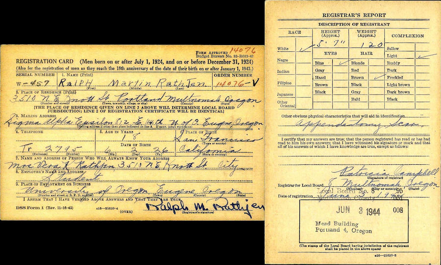 Birth Born on June 02, 1926 in San Francisco, San Francisco Co., CA Death Died on September 12, 2007 in Portland, Multnomah Co., OR Marriages NICHOLS, Joanne Elizabeth Married on June 09, 1950 in Portland, Multnomah Co., OR Notes Occupation: Theatre Manager Sources Oregon Deaths: #7-23076 Images Ralph Rathjen WW2 Draft