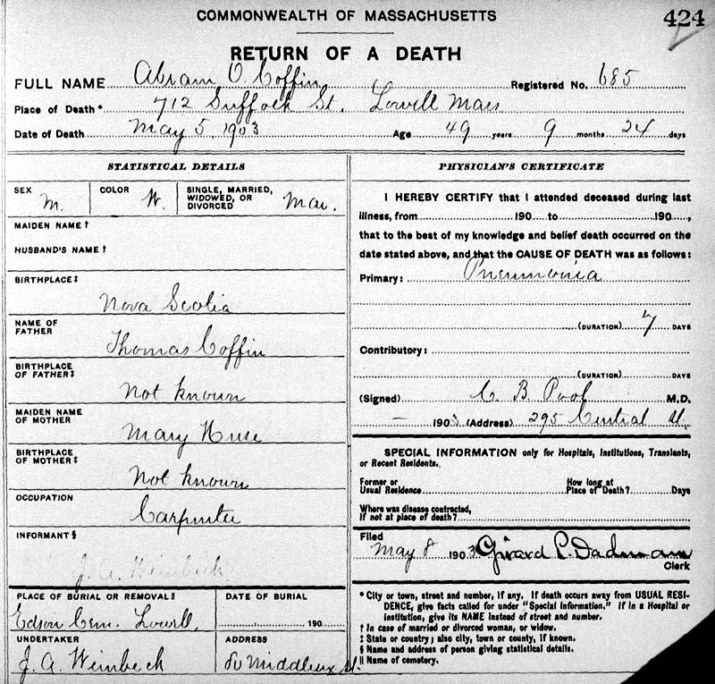 Birth Born on July 11, 1853 in Millville, Kings Co., NS Death Died on May 05, 1903 in Lowell, Middlesex Co., MA Buried in Edson Cemetery in Lowell, Middlesex Co., MA Marriages NICHOLS, Mary Jane Married on November 26, 1879 in Nicholsville, Kings Co., NS Children COFFIN, Laura Mae: August 10, 1880 - March 03, 1968 COFFIN, Ella Maude: September 25, 1882 - March 02, 1970 COFFIN, Percy W.: August 18, 1883 - September 11, 1883 COFFIN, Arthur Raymond: January 06, 1887 - February 07, 1960 COFFIN, Amy Louise: August 09, 1893 - January 31, 1895 COFFIN, Cora Blanche: March 10, 1896 - May 27, 1973 COFFIN, Charles Dodge: July 04, 1899 - December 22, 1952 COFFIN, Lilla R.: September 14, 1900 - November 07, 1901 Notes Occupation: Mechanic/ Carpenter Sources Massachusetts Deaths: Lowell Pg. 424 #685 Images Abraham & Mary J. (Nichols) Coffin & Percy,Amy,Lilla Coffin Abraham Coffin Death Mary J. Nichols Marriage Abraham Coffin