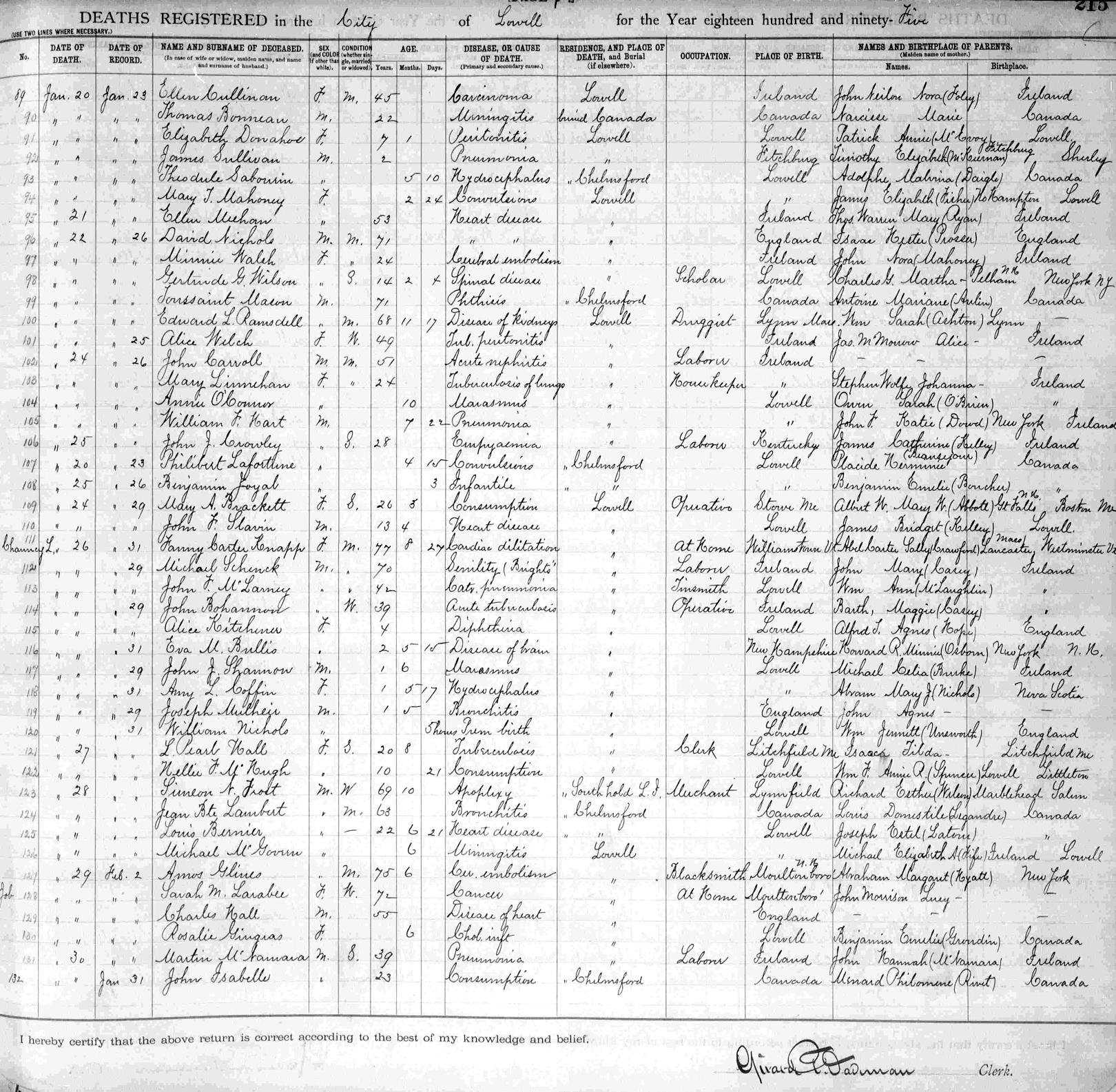 Parents Father: COFFIN, Abraham Owen Mother: NICHOLS, Mary Jane Birth Born on August 09, 1893 in Lowell, Middlesex Co., MA Death Died on January 31, 1895 in Lowell, Middlesex Co., MA Notes Death: Hydrocephalus Sources Massachusetts Deaths: Lowell Pg. 215 #118 Images Amy Coffin Birth Abraham & Mary J. (Nichols) Coffin & Percy,Amy,Lilla Coffin Amy Coffin Death
