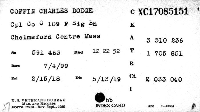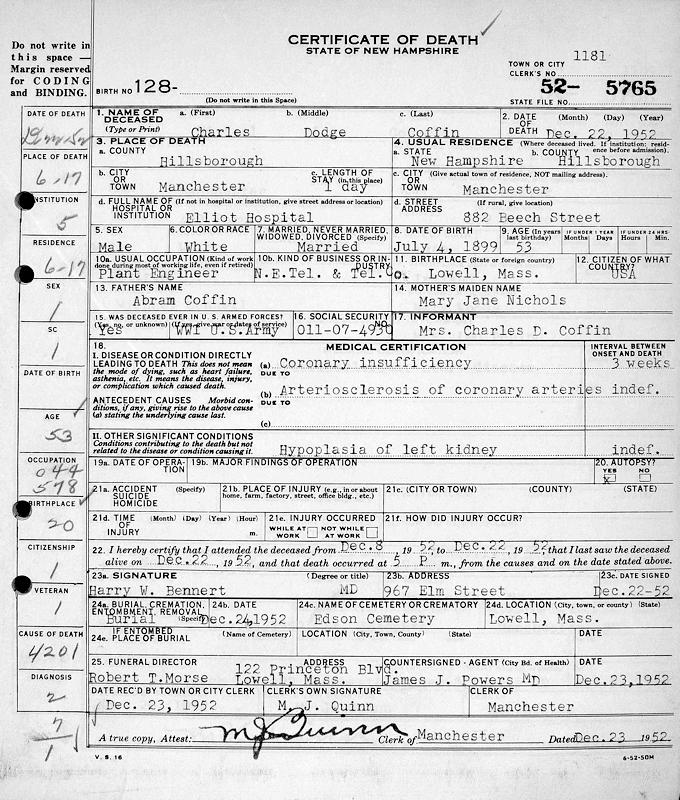 Parents Father: COFFIN, Abraham Owen Mother: NICHOLS, Mary Jane Birth Born on July 04, 1899 in Lowell, Middlesex Co., MA Death Died on December 22, 1952 in Manchester, Hillsborough Co., NH Buried in Edson Cemetery in Lowell, Middlesex Co., MA Marriages DANIELS, Myrtle Marion Married on September 17, 1924 in Lowell, Middlesex Co., MA Children COFFIN, Charles Donald: December 06, 1925 - December 12, 1925 COFFIN, Donald: 1928 Notes Military Service: WW1 Us Army Occupation: Electrical Engineer New England Telephone Co. Death: Coronary Insufficiency Sources New Hampshire Deaths: #52-5765 Images Charles Coffin Birth Charles D. & Myrtle (Daniels) & Charles D. Jr Coffin & Agnes (Watson) Coffin Charles D. Coffin Death Charles D. Coffin Marriage Charles D. Coffin Military Service