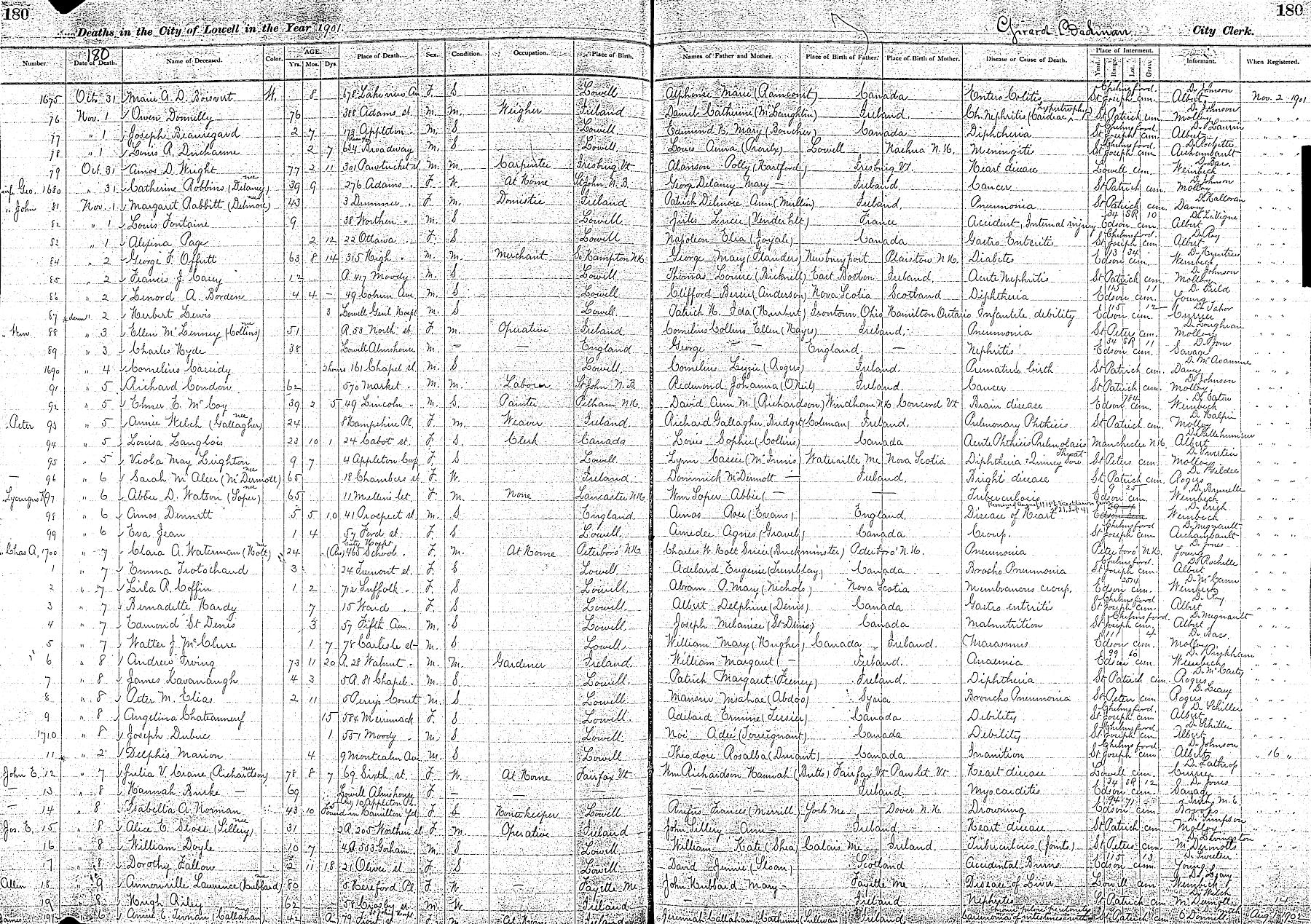Parents Father: COFFIN, Abraham Owen Mother: NICHOLS, Mary Jane Birth Born on September 14, 1900 in Lowell, Middlesex Co., MA Death Died on November 07, 1901 in Lowell, Middlesex Co., MA Buried in Edson Cemetery in Lowell, Middlesex Co., MA Notes Death: Membranous Croup Sources Massachusetts Deaths: Lowell Pg. 180 #1702 Images Lilla Coffin Birth Abraham & Mary J. (Nichols) Coffin & Percy,Amy,Lilla Coffin Lilla Coffin Death