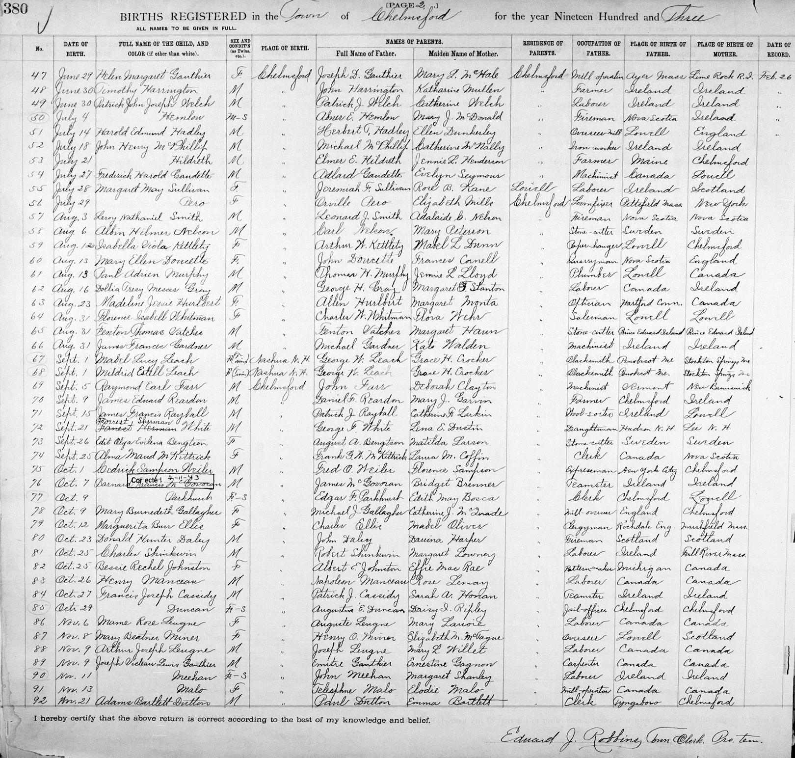 Parents Father: McKITTRICK, Francis George Wellington Mother: COFFIN, Laura Mae Birth Born on September 25, 1903 in Chelmsford, Middlesex Co., MA Death Died on May 08, 1980 in Lowell, Middlesex Co., MA Buried in Pine Ridge Cemetery in Chelmsford, Middlesex Co., MA Marriages HOLCOMB, Glendon H. Children HOLCOMB, Marilyn L.: July 01, 1938 - April 04, 2022 Notes Occupation: Stenographer Sources Massachusetts Deaths: #029744 Images Alma McKittrick Birth Glenn & Alma (McKittrick) Holcomb