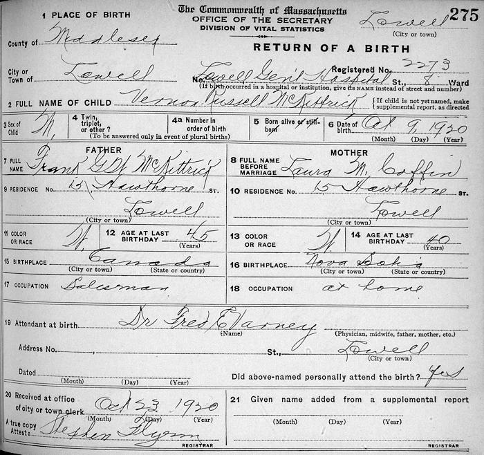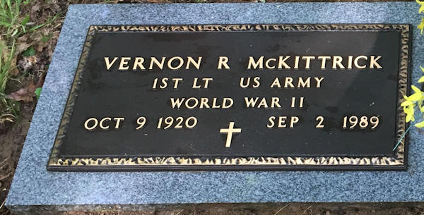 Parents Father: McKITTRICK, Francis George Wellington Mother: COFFIN, Laura Mae Birth Born on October 09, 1920 in Lowell, Middlesex Co., MA Death Died on September 02, 1989 in Newland, Avery Co., NC Buried in Crossnore Presbyterian Church Cemetery in Crossnore, Avery Co., NC Marriages MARTIN, Louise Marion Married on 1943 in Lowell, Middlesex Co., MA Children McKITTRICK, Paula: July 29, 1946 McKITTRICK, Dana Charles: January 22, 1948 Notes Military Service: WW2 US Army Air Corps Lieutenant Navigator of B-17 Bombers Occupation: Salesman Textile Machinery Death: Renal Cell Carcinoma Sources North Carolina Deaths: #37751 Images Vernon McKittrick Birth Vernon McKittrick Vernon McKittrick Death Louise (Martin) & Vernon McKittrick
