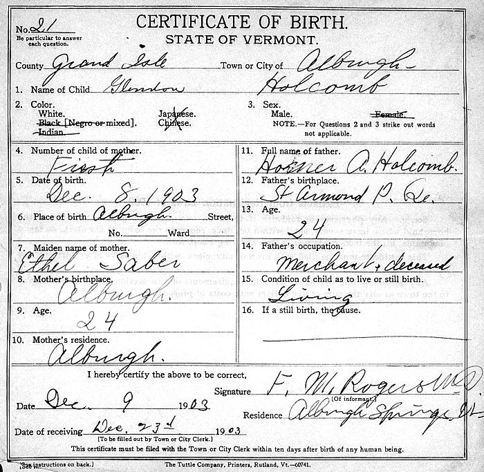 Birth Born on December 08, 1903 in Alburg, Grand Isle Co., VT Death Died on October 06, 1990 in Chelmsford, Middlesex Co., MA Buried in Pine Ridge Cemetery in Chelmsford, Middlesex Co., MA Marriages McKITTRICK, Alma Maud Children HOLCOMB, Marilyn L.: July 01, 1938 - April 04, 2022 Notes Occupation: Clerk/ Office Manager Sources Massachusetts Deaths: #048029 Images Glendon Holcomb Birth Glenn & Alma (McKittrick) Holcomb