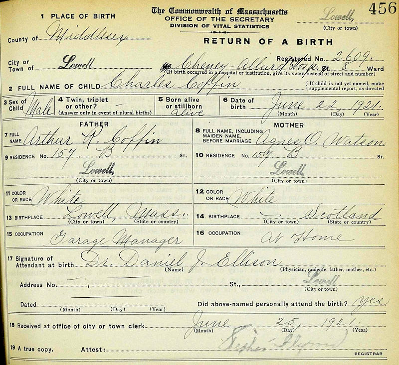 Parents Father: COFFIN, Arthur Raymond Mother: WATSON, Agnes Orr Birth Born on June 22, 1921 in Lowell, Middlesex Co., MA Death Died on March 14, 1990 in Dunedin, Pinellas Co., FL Notes Occupation: Clerk Sources Florida Deaths: #35279 Images Charles Coffin Birth