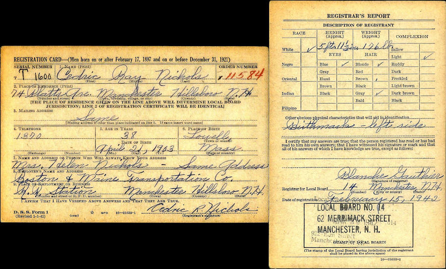 Parents Father: NICHOLS, Everett Ernest Mother: COLLINS, Mary Ellen (Ray) Birth Born on April 21, 1903 in Lowell, Middlesex Co., MA Death Died on December 08, 1962 in Quincy, Norfolk Co., MA Buried in Woodbine Cemetery in Lowell, Middlesex Co., MA Marriages RULE, Helen Collier Children NICHOLS, Everett Ray: July 16, 1928 - January 08, 1996 NICHOLS, Helen Marion: November 27, 1929 - February 21, 2016 NICHOLS, Verna Alice: May 24, 1940 Notes Occupation: Grocery Store Clerk/ Inspector Boston & Maine RR/ Superintendant Sources Newspaper Obituary: Boston Record American Boston,MA December 17,1962 Images Cedric Nichols Birth Everett & Mary (Collins) & Cedric Nichols Cedric Nichols WW2 Draft