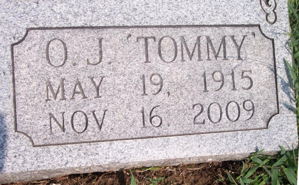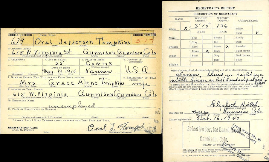 Birth Born on May 09, 1915 in Downs, Osborne Co., KS Death Died on November 16, 2009 in Springfield, Greene Co., MO Buried in Lone Star Cemetery in Mountain Grove, Wright Co., MO Marriages NICHOLS, Helen Marion Married on November 28, 1988 in Mountain Grove, Wright Co., MO Notes Occupation: Welder/ Electrician/ Miner/ Snake Hunter Obituary: Funeral services for Oral "Tom" Tompkins, were held on Friday, November 20, 2009 in the Craig-Hurtt Chapel with Rev. Greg Thompson officiating. Stephanie Gaston served as singer. Song selections were "Amazing Grace," "How Great Thou Art," and "I'll Fly Away." Pallbearers were Paul Gaston, Tommie Gaston, Harland Mayfield, Evan Tyrrell, Nicholas Moody and Leonard Sanders. Burial was in the Lone Star Cemetery under the direction of the Craig-Hurtt Funeral Home, Mountain Grove, Mo. Oral J. "Tom" Tompkins, son of the late Ervin Erskine and Lola Belle (Hawley) Tompkins, was born on May 9, 1915 in Kansas and departed this life on Monday, November 16, 2009 in the Manor Care Nursing Center in Springfield, Mo. He was 94 years, 6 months and 7 days of age. Tom grew up in the Gunnison, Co. area and graduated from Gunnison High School. He was united in marriage to Grace Yoder on July 9, 1938 in Gunnison, Co. Three children were born to this union. Following Tom's retirement in 1977, they moved to Mountain Grove, Mo. Mrs. Tompkins passed away on February 5, 1988. Following the death of Grace, in the fall of 1988 he married Helen M. "Penny" Nichols. They lived on Frisco Street in Mountain Grove for many years before making their home in the Autumn Oaks Caring Center. Tom was employed as a welder in the shipyards during World War II. He had various jobs over the years, such as; an electrician, miner, and hunting snakes. He also had his Pastor's license. Tom had several hobbies throughout his life. He enjoyed playing the drums in area bands and woodworking. While his health permitted, he attended the Pentecostal Lighthouse Church in Mountain Grove where he enjoyed visiting with his many friends. Besides his parents and his first wife, he was preceded in death by one brother, Clyde; and by one sister, Eilene. He is survived by his two sons, Scott Tompkins and his wife, Sandy, of Hawaii, and Bernie Tompkins and his wife, Debbie, of Arlington, Texas; one daughter, Lillie Gaston and her husband, Paul, of Mountain Grove and North Fort Myers, Florida; his wife, Helen "Penny" Tompkins of Mountain Grove; nine grandchildren, Tommie, Shona, Joy, Rocky, Bonnie, Melody, Traci, Nikki, and Christi; nine great grandchildren, Marinda, Nick, Stephanie, LeAnna, Cody, Morgan, Bailey, Kaeden, and Elijah; one great great grandchild, Peyton; one sister, Elsie Martin of Colorado; and a host of other relatives and friends who will miss him very much. Online Condolences: www.craighurttfuneralhome.com Images Oral Tompkins Oral Tompkins WW2 Draft