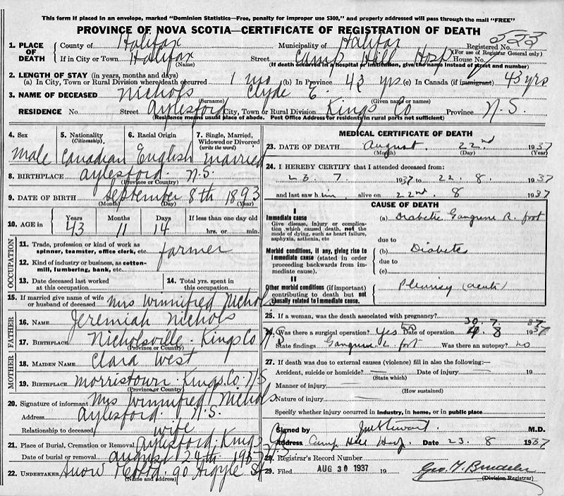 Parents Father: NICHOLS, Jeremiah Isaac Mother: WEST, Clara Alice Birth Born on December 08, 1893 in Nicholsville, Kings Co., NS Death Died on August 22, 1937 in Halifax, Halifax Regional Municipality, NS Buried in Aylesford Union Cemetery in Aylesford, Kings Co., NS Marriages WARNE, Winifred Married on 1917 in Rochford, Essex, England Children NICHOLS, Clara Joyce: September 14, 1918 - February 07, 1995 NICHOLS, Laura LeMoine: 1921 NICHOLS, Benjamin Charles: June 18, 1923 - March 08, 2013 NICHOLS, Roderick Clyde: June 15, 1925 - February 14, 2013 NICHOLS, Geraldine Myrtle: 1928 Notes Death: Gangrene of Foot/ Diabetes Occupation: Farmer/ Electric Engineer Military Service: WW1 CEF Sources Nova Scotia Deaths: Year 1937 File 169 #523 Images Charles B. & Clariss (Broomfield) Nichols & Clyde & Winifred (Warne) Nichols Clyde Nichols Death Clyde Nichols