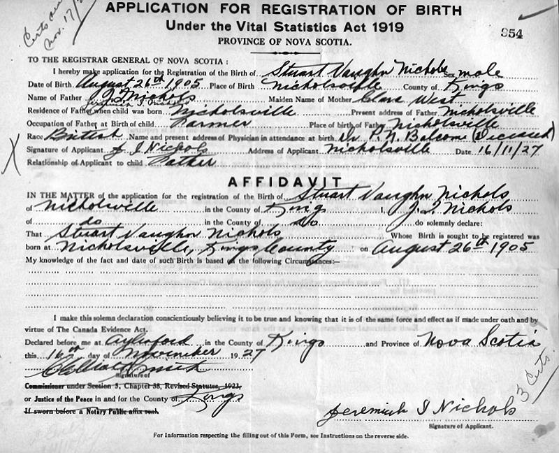 Parents Father: NICHOLS, Jeremiah Isaac Mother: WEST, Clara Alice Birth Born on August 26, 1905 in Nicholsville, Kings Co., NS Death Died on January 12, 1980 in Morristown, Kings Co., NS Buried in Morristown Cemetery in Morristown, Kings Co., NS Marriages PALMER, Muriel Elizabeth Married on September 24, 1930 in Morristown, Kings Co., NS Children NICHOLS, Vaughn Stuart: April 02, 1932 - February 05, 2019 Notes Occupation: Entomologist Sources Findagrave.com: https://www.findagrave.com/memorial/107541478/stuart_vaughn-nichols Images Stuart Nichols Birth Stuart & Muriel (Palmer) Nichols Stuart Nichols Marriage Stuart Nichols