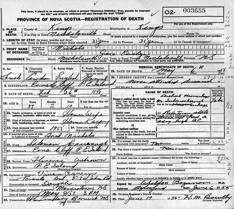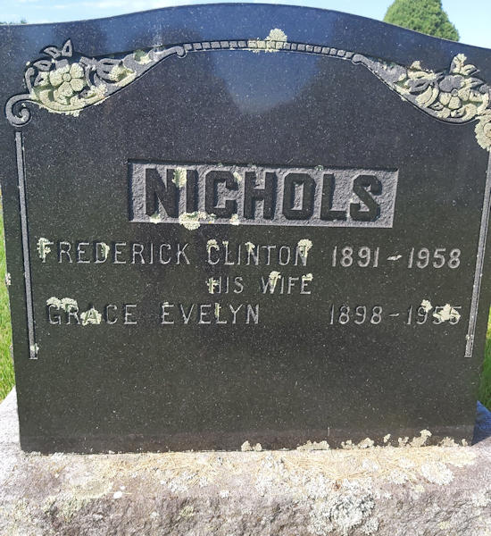 Birth Born on February 26, 1898 in Earnscliffe, Queens Co., PE Death Died on May 06, 1955 in Nicholsville, Kings Co., NS Buried in Morristown Cemetery in Morristown, Kings Co., NS Marriages NICHOLS, Frederick Clinton Married on December 25, 1921 in Charlottetown, Queens Co., PE Children NICHOLS, Lawson NICHOLS, Florence Iona: September 26, 1922 - May 26, 1991 NICHOLS, Clara Genevieve: March 09, 1924 - August 26, 1992 NICHOLS, Frederick Seldon: July 02, 1925 - 2017 NICHOLS, Vivian Gwendolyn: August 15, 1928 - October 28, 1984 NICHOLS, Ruth Madeline: December 03, 1932 - February 17, 2025 Notes Death: Cerebral Hemorhage Sources Nova Scotia Deaths: Year 1955 #3655 Images Frederick & Grace (Cavanagh) Nichols Grace (Cavanagh) Nichols Death