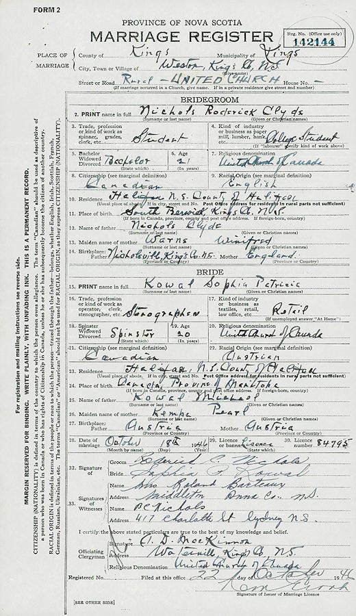 Birth Born on May 29, 1926 in Chatfield, Interlake Region, MB Death Died on May 19, 2016 in Berwick, Kings Co., NS Buried in Aylesford, Kings Co., NS Marriages NICHOLS, Roderick Clyde Married on October 18, 1946 in Weston, Kings Co., NS Children NICHOLS, Brian NICHOLS, Shelley NICHOLS, Gail Winifred: 1948 NICHOLS, Leslie Leigh: October 01, 1954 - March 10, 2020 NICHOLS, Mark Roderick: 1962 Notes Obituary: Sophia "Patricia" NICHOLS (KOWAL) of Berwick and formerly of Lawrencetown, Annapolis County, passed away peacefully at the Grand View Manor on May 19, 2016 at the age of 89 years. The daughter of the late Michael and Paraska (Kempa) Kowal, she was born in Chatfield, Manitoba on May 29, 1926. After schooling in Chatfield and Winnipeg, Pat worked at the Connaught Laboratories in Toronto during the early years of WWII and then enlisted in the Canadian Women's Army Corps (CWAC) where she served until September 1946. She met and married the love of her life, her husband Roderick Nichols, and they had 66 adventuresome years together. She was a member of the Lawrencetown Legion Branch 112. A devoted wife, mother, grandmother, and great-grandmother, she found her greatest happiness in devoting herself to her husband and family and helping others. She loved gardening and cooking. Her warm smile and loving personality, with just a hint of mischievousness, endeared her to everyone who knew her. She is survived by her sons, Brian Nichols (Lynne Campbell), of Dartmouth, and Mark Nichols (Sherry), of Hereford, Arizona; her daughters, Gail Nichols (Richard Cherry), of Tamarac, Florida, Leslie Jordan (Neil), of Chipman Corner, and Shelley Baltzer (Garry), of Canning; her sisters, Nancy Oakes, of Vernon, B.C. and Ollie Vinton of Noble Park, Australia, as well as seven grandchildren and three great-grandchildren. She was predeceased by her husband Rod; brothers John Kowal and Bill Kowal, and sisters Anne Komarowsky, Kathy Osnach, and Marion Olthuis, all of Ontario. Arrangements have been entrusted to Serenity Lindsay Berwick Funeral Chapel, 192 Commercial Street Berwick (902-538-9900). No visitation or flowers by request. A family gathering will be held at Berwick Funeral Chapel on May 26, 2016, at 11:00 a.m. with interment at the Aylesford Union Cemetery to follow at 1:00 p.m. with Rev. Sarah Scott officiating. Memorial donations in memory of Pat may be made to a charity of choice. Occupation: Employee at Connaught Laboratories/ Stenographer Military Service: WW2 Canadian Women's Army Corps Sources Funeral Home: Serenity Lindsay Berwick Funeral Chapel Berwick,NS Obituary May 2016 Images Roderick & Sophia (Kowal) Nichols Roderick Nichols Marriage Sophia (Kowal) Nichols