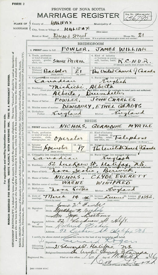 Birth Born on 1924 in Drumheller, Census Divison 5, AB Marriages NICHOLS, Geraldine Myrtle Married on March 14, 1946 in Halifax, Halifax Regional Municipality, NS Notes Military Service: WW2 RCNVR Shore Patrol Images Geraldine Nichols Marriage