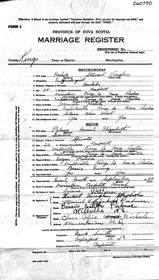 Parents Father: PALMER, Edgar Burton Mother: EWING, Bessie Estella Birth Born on September 19, 1907 in Millville, Kings Co., NS Death Died on July 27, 1980 in Kings Co., NS Buried in Morristown Cemetery in Morristown, Kings Co., NS Marriages NICHOLS, Stuart Vaughn Married on September 24, 1930 in Morristown, Kings Co., NS Children NICHOLS, Vaughn Stuart: April 02, 1932 - February 05, 2019 Notes Occupation: Teacher Sources Findagrave.com: https://www.findagrave.com/memorial/107541516/muriel-elizabeth-nichols Images Muriel Palmer Birth Stuart & Muriel (Palmer) Nichols Stuart Nichols Marriage