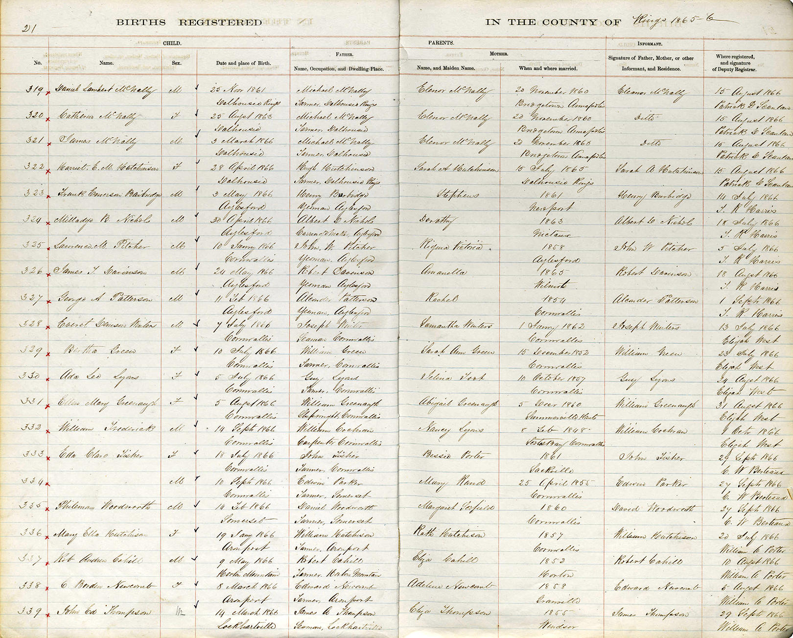 Birth Born on April 30, 1866 in Aylesford, Kings Co., NS Marriages PALMER, Dora Edith Married on June 04, 1890 in Millville, Kings Co., NS Images Millege Nichols Birth Dora Palmer Marriage