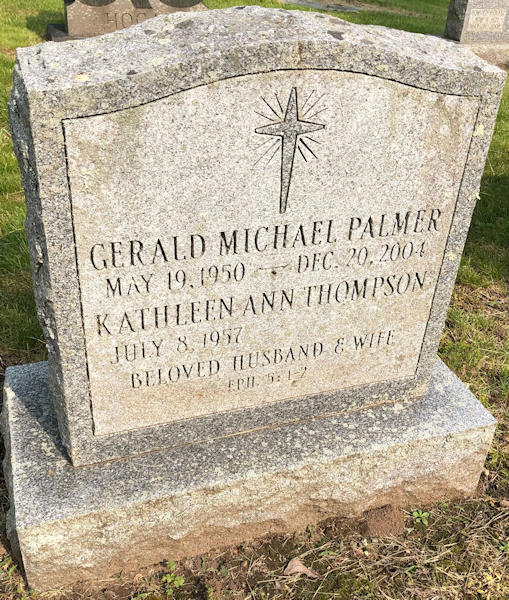Parents Father: PALMER, Morley Benjamin Mother: CURLEE, Frances Marion Birth Born on May 19, 1950 in Hartford, Hartford Co., CT Death Died on December 20, 2004 in Hebron, Tolland Co., CT Buried in Fountain Hill Cemetery in Deep River, Middlesex Co., CT Marriages THOMPSON, Kathleen Ann Children PALMER, Meghan D.: September 25, 1973 Notes Obituary: Mr. Gerald Michael Palmer, 54, beloved husband of Kathleen (Thompson) of Hebron, CT, formerly of Glastonbury, was received into the arms of his beloved Savior, Jesus Christ on Monday, December 20, 2004, while cleaning up after the snow storm. Born in Hartford, a son of Frances (Curlee) Palmer and the late Morley Palmer, he lived in Cromwell for many years before moving to Glastonbury and then Hebron. He was a graduate of the University of Connecticut, where he received his Ph.D. and later taught Geography. He was a member of the Glastonbury Community Church where he was choir director and worship leader for over 20 years in joyful partnership with his wife. He was a member of the Gilbert and Sullivan Society, and the vulcan Riders and Owners Club. Besides his wife and mother, he leaves a daughter, Meghan and her husband Joshua Wessel of Cromwell; a sister Sharon Palmer of Middletown; his father and mother-in-law Arthur and Dorothy Thompson of Deep River; his two sisters-in-law, Virginia and her husband Kevin Wynne of Cumberland, Rhode Island; and Ann Thompson of Malden, MA. Occupation: Geography Professor Sources Cemetery: Fountain Hill Cemetery Deep River,CT Images Gerald & Kathleen(Thompson) Palmer