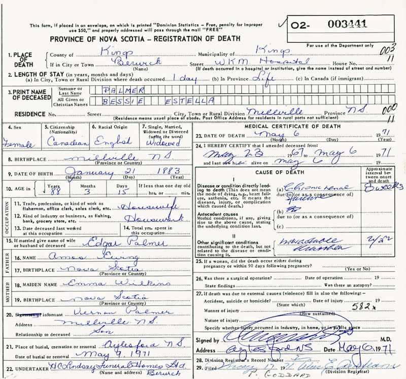 Birth Born on January 21, 1883 in Millville, Kings Co., NS Death Died on May 06, 1971 in Berwick, Kings Co., NS Buried in Aylesford Union Cemetery in Aylesford, Kings Co., NS Marriages PALMER, Edgar Burton Married on November 16, 1904 in Millville, Kings Co., NS Children PALMER, Claude W.: January 19, 1906 - May 21, 1988 PALMER, Muriel Elizabeth: September 19, 1907 - July 27, 1980 PALMER, Hazel B.: July 12, 1909 - December 24, 1976 PALMER, Vernon Handley: April 10, 1910 - March 28, 1997 Notes Death: Chronic Renal Failure Sources Nova Scotia Deaths: Year 1971 #3441 Images Bessie Ewing Birth Bessie (Ewing) Palmer Death Edgar Palmer Marriage