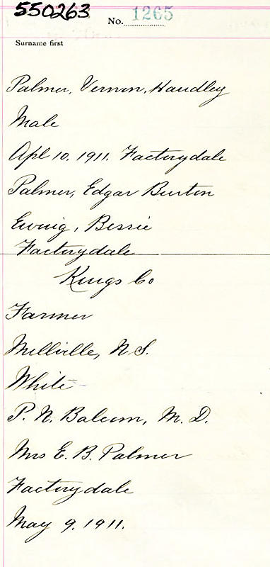 Parents Father: PALMER, Edgar Burton Mother: EWING, Bessie Estella Birth Born on April 10, 1910 in Factorydale, Kings Co., NS Death Died on March 28, 1997 in Kentville, Kings Co., NS Buried in Aylesford Union Cemetery in Aylesford, Kings Co., NS Marriages CROCKER, Lorna Marguerite Married on March 08, 1938 in Aylesford, Kings Co., NS Children PALMER, Milton PALMER, Linda Notes Occupation: Farmer Obituary: PALMER, Vernon Hanley - 85, Millville, Kings Co., died March 28, 1997, in Valley Regional Hospital, Kentville. Born in Factorydale, Kings Co., he was a son of the late Edgar and Bessie (Ewing) Palmer. He had owned and operated his own mixed farm in Millville, retiring in 1977. He was the last surviving member of his immediate family. Surviving are son, Milton, Millville; daughter, Linda (Mrs. Chesley Shave), Dartmouth; four grandchildren; several nieces and nephews. He was predeceased by his wife, Lorna M. (Crocker); brother, Claude; sisters, Muriel Nichols, Hazel Lowder. Visitation 7-9 p.m. today, funeral 2 p.m. Tuesday, both in H.C. Lindsay Memorial Chapel, Berwick, Rev. Wayne Schurman officiating. Burial in Aylesford Union Cemetery. Family flowers only. Donations to Parkinson's Foundation of Canada, Nova Scotia Division; Heart and Stroke Foundation of Nova Scotia or any charity. Sources Funeral Home: H.C. Lindsay Memorial Chapel Berwick,NS Obituary March 1997 Images Vernon Palmer Birth Vernon Palmer Marriage